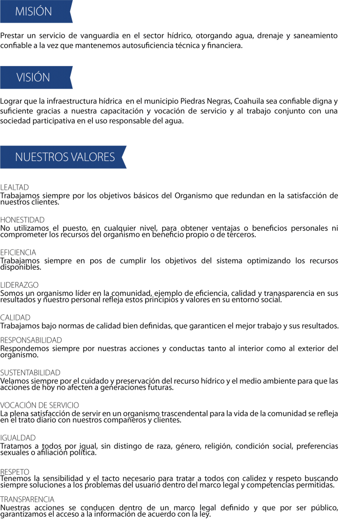 “Somos una empresa que brinda a la comunidad los servicios de Agua Potable, Alcantarillado y Saneamiento de manera ininterrumpida, cumpliendo con las normas aplicables y contribuyendo al cuidado del medio ambiente a través de una mejora continua”